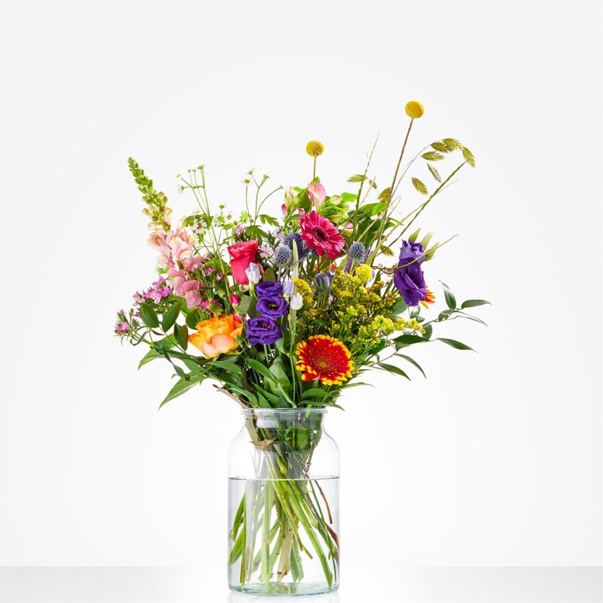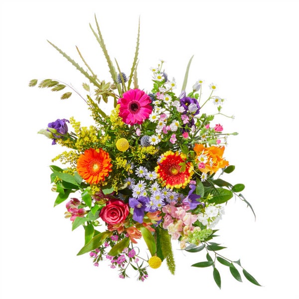 Wauw, dit boeket is echt een plaatje! Wil je iemand feliciteren, opvrolijken of bedanken? Dan is dit boeket het perfecte cadeau. Door de opvallende en kleurrijke bloemen in plukstijl, vrolijkt dit boeket iedereen op. (excl. vaas)